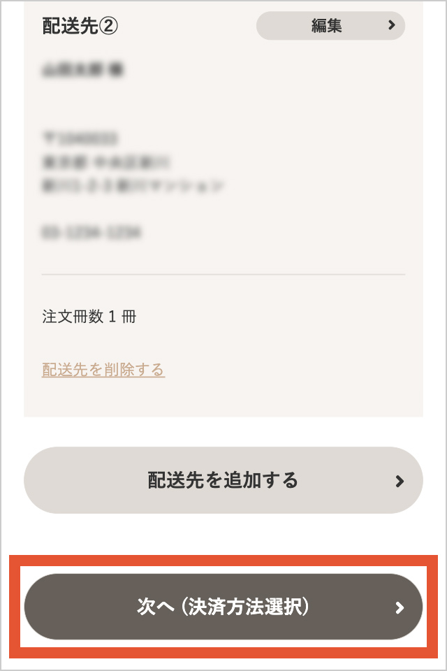 「次へ(決済方法選択)」を選択して、ご注文手続きをします。