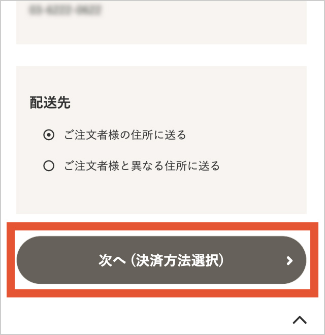 ご注文者様情報と配送先の設定が完了したら「次へ(決済方法選択)」を選択します。