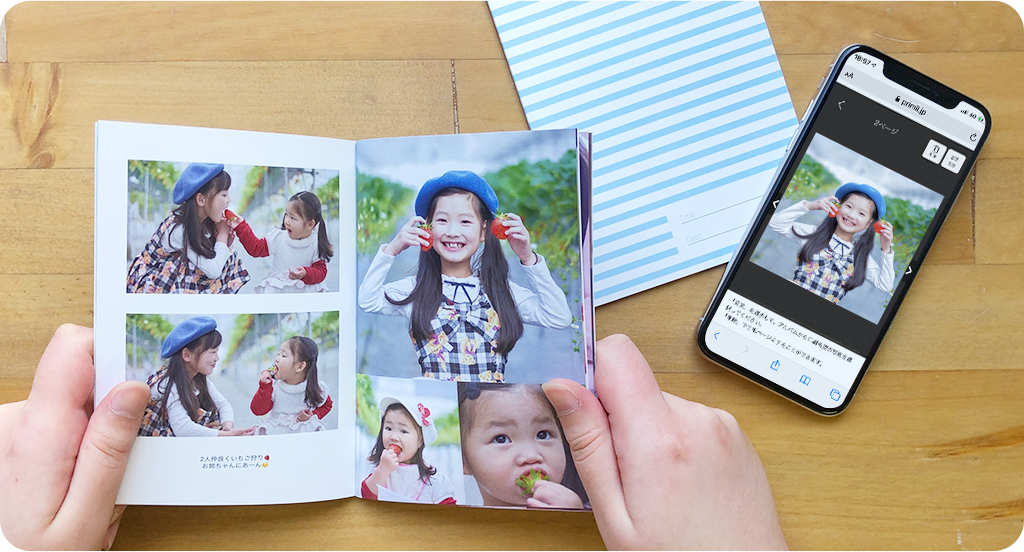 プリミィアプリを使えば、最大208枚(表紙1枚と1ページに最大9枚)まで写真を入れられます。また、写真表紙へのタイトルやフォトブック内のコメント入力も可能です。