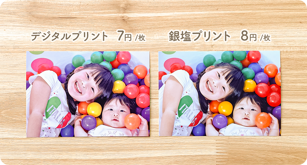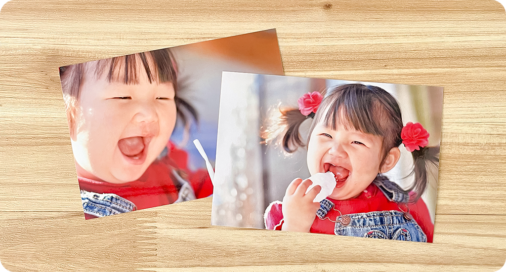 銀塩プリントは、水に強く耐久性に優れているため子どもの成長記録に最適です。写真屋さんと同じ印刷方法のため発色が良く仕上がりがきれいです。